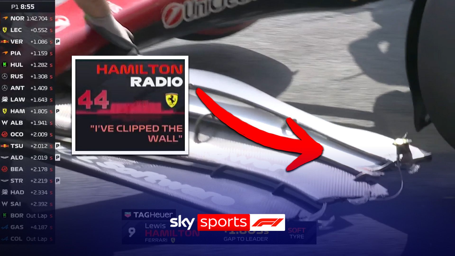 Lewis Hamilton limps into the pit after clipping the wall during FP1 at the Azerbaijan GP.